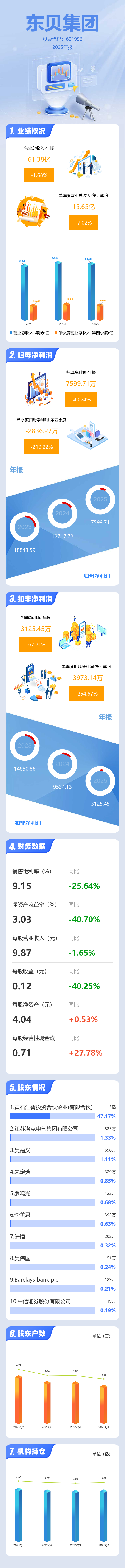 证券之星消息,东贝集团2025年年报显示,当年度公司主营收入61.38亿元,同比下降1.68%;归母净利润7599.71万元,同比下降40.24%;扣非净利润3125.45万元,同比下降67.22%;其中2025年第四季度,公司单季度主营收入15.65亿元,同比下降7.02%;单季度归母净利润-2836.27万元,同比下降219.23%;单季度扣非净利润-3973.14万元,同比下降254.67%;负债率64.03%,投资收益-308.27万元,财务费用2033.77万元,毛利率9.15%。