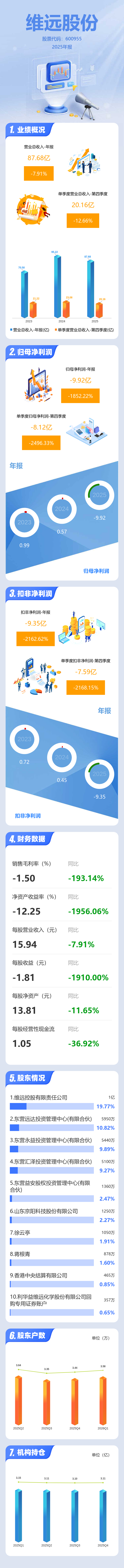 证券之星消息,维远股份2025年年报显示,当年度公司主营收入87.68亿元,同比下降7.91%;归母净利润-9.92亿元,同比下降1852.22%;扣非净利润-9.35亿元,同比下降2162.62%;其中2025年第四季度,公司单季度主营收入20.16亿元,同比下降12.66%;单季度归母净利润-8.12亿元,同比下降2496.33%;单季度扣非净利润-7.59亿元,同比下降2168.15%;负债率35.93%,投资收益104.53万元,财务费用9696.37万元,毛利率-1.5%。