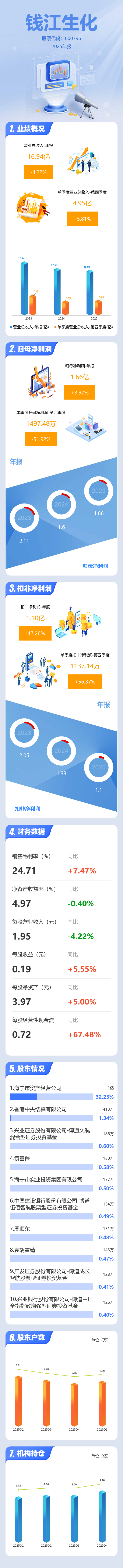 证券之星消息,钱江生化2025年年报显示,当年度公司主营收入16.94亿元,同比下降4.22%;归母净利润1.66亿元,同比上升3.98%;扣非净利润1.1亿元,同比下降17.26%;其中2025年第四季度,公司单季度主营收入4.95亿元,同比上升5.82%;单季度归母净利润1497.48万元,同比下降51.92%;单季度扣非净利润1137.14万元,同比上升56.38%;负债率51.21%,投资收益5268.3万元,财务费用6084.48万元,毛利率24.71%。