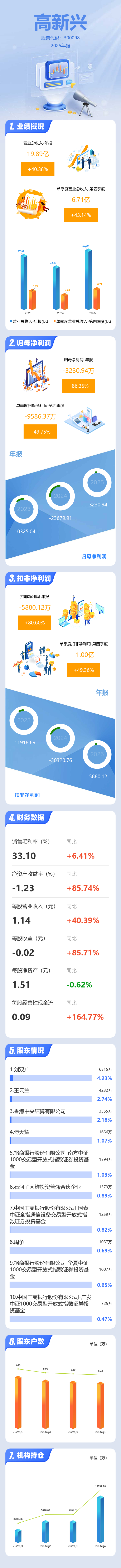 证券之星消息,高新兴2025年年报显示,当年度公司主营收入19.89亿元,同比上升40.39%;归母净利润-3230.94万元,同比上升86.36%;扣非净利润-5880.12万元,同比上升80.61%;其中2025年第四季度,公司单季度主营收入6.71亿元,同比上升43.15%;单季度归母净利润-9586.37万元,同比上升49.76%;单季度扣非净利润-1.0亿元,同比上升49.36%;负债率45.45%,投资收益-1023.14万元,财务费用-2193.85万元,毛利率33.1%。