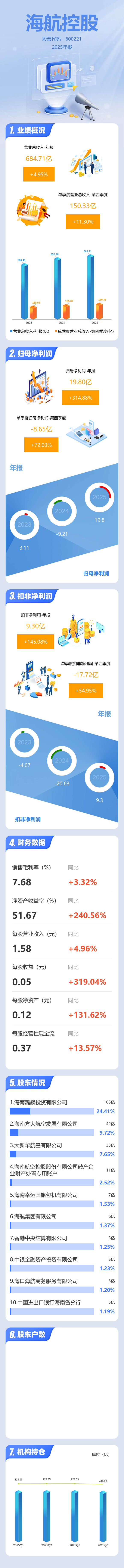 证券之星消息,海航控股2025年年报显示,当年度公司主营收入684.71亿元,同比上升4.96%;归母净利润19.8亿元,同比上升314.89%;扣非净利润9.3亿元,同比上升145.08%;其中2025年第四季度,公司单季度主营收入150.33亿元,同比上升11.3%;单季度归母净利润-8.65亿元,同比上升72.03%;单季度扣非净利润-17.72亿元,同比上升54.95%;负债率96.47%,投资收益6.64亿元,财务费用23.03亿元,毛利率7.68%。