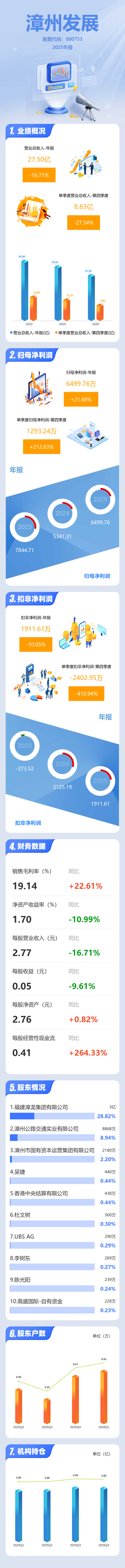 证券之星消息,漳州发展2025年年报显示,当年度公司主营收入27.5亿元,同比下降16.71%;归母净利润6499.76万元,同比上升21.69%;扣非净利润1911.61万元,同比下降10.05%;其中2025年第四季度,公司单季度主营收入8.83亿元,同比下降27.34%;单季度归母净利润1293.24万元,同比上升212.64%;单季度扣非净利润-2402.95万元,同比下降410.94%;负债率64.35%,投资收益-979.37万元,财务费用-1.32亿元,毛利率19.14%。