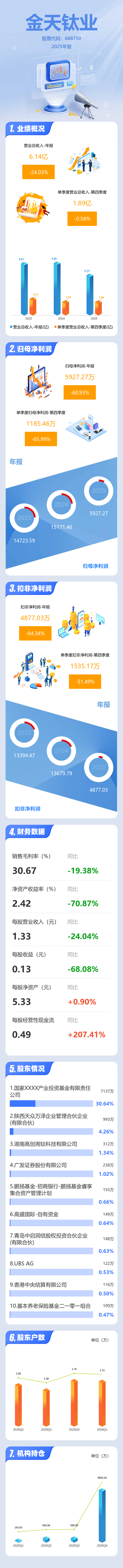 证券之星消息,金天钛业2025年年报显示,当年度公司主营收入6.14亿元,同比下降24.04%;归母净利润5927.27万元,同比下降60.93%;扣非净利润4877.03万元,同比下降64.35%;其中2025年第四季度,公司单季度主营收入1.89亿元,同比下降0.59%;单季度归母净利润1185.46万元,同比下降66.0%;单季度扣非净利润1535.17万元,同比下降51.5%;负债率33.43%,投资收益1132.69万元,财务费用853.4万元,毛利率30.67%。
