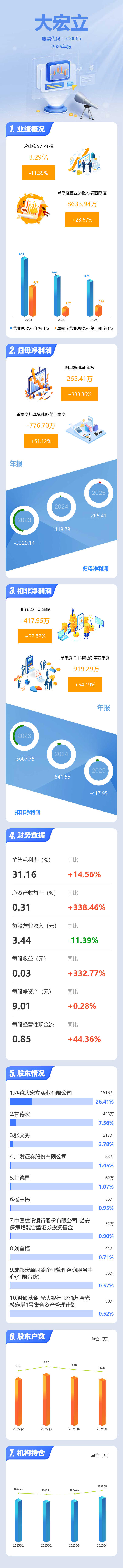 证券之星消息,大宏立2025年年报显示,当年度公司主营收入3.29亿元,同比下降11.4%;归母净利润265.41万元,同比上升333.36%;扣非净利润-417.95万元,同比上升22.82%;其中2025年第四季度,公司单季度主营收入8633.94万元,同比上升23.67%;单季度归母净利润-776.7万元,同比上升61.12%;单季度扣非净利润-919.29万元,同比上升54.19%;负债率19.07%,投资收益-0.64万元,财务费用-248.89万元,毛利率31.16%。