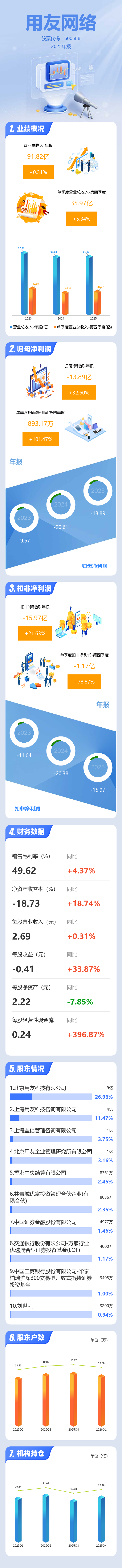 证券之星消息,用友网络2025年年报显示,当年度公司主营收入91.82亿元,同比上升0.32%;归母净利润-13.89亿元,同比上升32.6%;扣非净利润-15.97亿元,同比上升21.64%;其中2025年第四季度,公司单季度主营收入35.97亿元,同比上升5.35%;单季度归母净利润893.17万元,同比上升101.47%;单季度扣非净利润-1.17亿元,同比上升78.87%;负债率57.25%,投资收益5020.45万元,财务费用1.42亿元,毛利率49.62%。