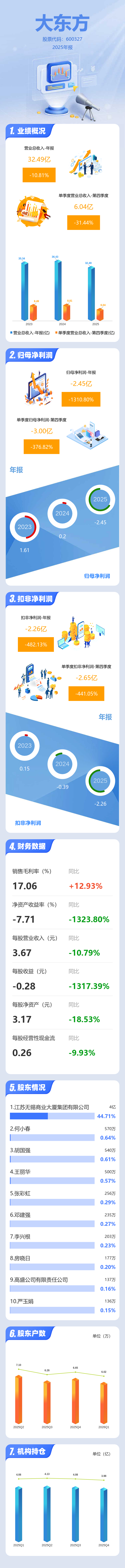 证券之星消息,大东方2025年年报显示,当年度公司主营收入32.49亿元,同比下降10.81%;归母净利润-2.45亿元,同比下降1310.81%;扣非净利润-2.26亿元,同比下降482.14%;其中2025年第四季度,公司单季度主营收入6.04亿元,同比下降31.45%;单季度归母净利润-3.0亿元,同比下降376.82%;单季度扣非净利润-2.65亿元,同比下降441.05%;负债率34.7%,投资收益-1.93亿元,财务费用4112.03万元,毛利率17.06%。