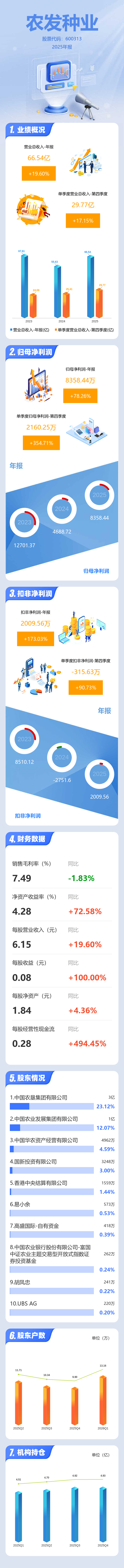 证券之星消息,农发种业2025年年报显示,当年度公司主营收入66.54亿元,同比上升19.6%;归母净利润8358.44万元,同比上升78.27%;扣非净利润2009.56万元,同比上升173.03%;其中2025年第四季度,公司单季度主营收入29.77亿元,同比上升17.15%;单季度归母净利润2160.25万元,同比上升354.72%;单季度扣非净利润-315.63万元,同比上升90.73%;负债率43.31%,投资收益720.64万元,财务费用1156.55万元,毛利率7.49%。