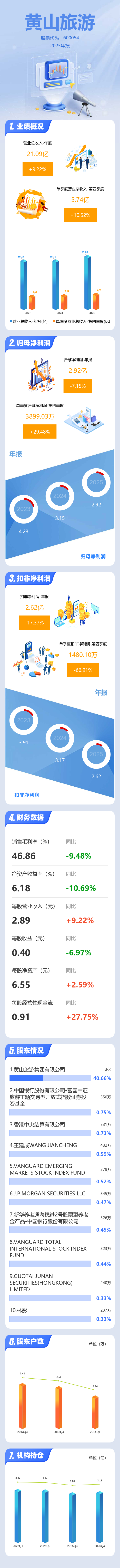证券之星消息,黄山旅游2025年年报显示,当年度公司主营收入21.09亿元,同比上升9.23%;归母净利润2.92亿元,同比下降7.15%;扣非净利润2.62亿元,同比下降17.38%;其中2025年第四季度,公司单季度主营收入5.74亿元,同比上升10.52%;单季度归母净利润3899.03万元,同比上升29.49%;单季度扣非净利润1480.1万元,同比下降66.92%;负债率18.52%,投资收益-2020.17万元,财务费用522.81万元,毛利率46.86%。