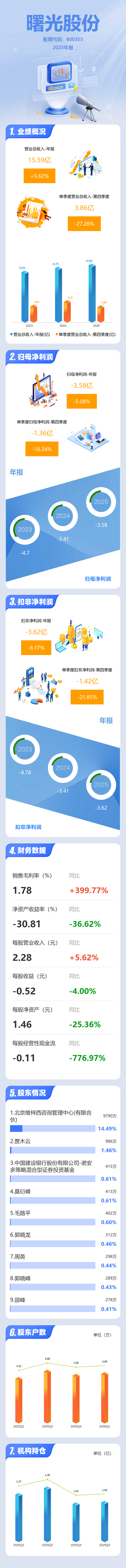 证券之星消息,曙光股份2025年年报显示,当年度公司主营收入15.59亿元,同比上升5.63%;归母净利润-3.58亿元,同比下降5.08%;扣非净利润-3.62亿元,同比下降6.18%;其中2025年第四季度,公司单季度主营收入3.86亿元,同比下降27.26%;单季度归母净利润-1.36亿元,同比下降16.34%;单季度扣非净利润-1.42亿元,同比下降21.85%;负债率68.19%,投资收益51.82万元,财务费用4492.73万元,毛利率1.78%。