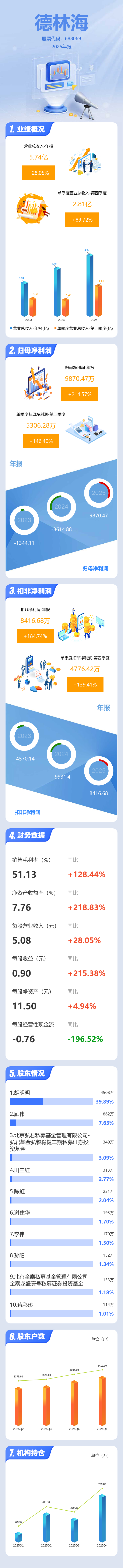 证券之星消息,德林海2025年年报显示,当年度公司主营收入5.74亿元,同比上升28.05%;归母净利润9870.47万元,同比上升214.57%;扣非净利润8416.68万元,同比上升184.75%;其中2025年第四季度,公司单季度主营收入2.81亿元,同比上升89.72%;单季度归母净利润5306.28万元,同比上升146.41%;单季度扣非净利润4776.42万元,同比上升139.41%;负债率24.32%,投资收益714.13万元,财务费用-608.73万元,毛利率51.13%。