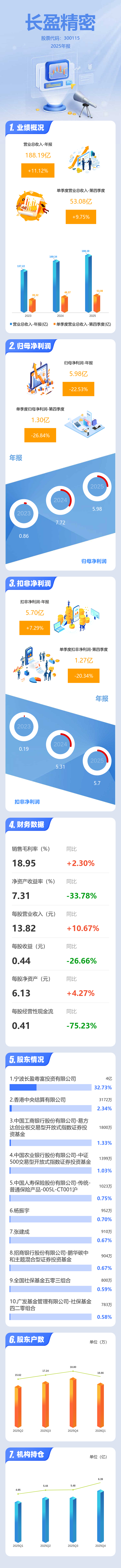 证券之星消息,长盈精密2025年年报显示,当年度公司主营收入188.19亿元,同比上升11.13%;归母净利润5.98亿元,同比下降22.53%;扣非净利润5.7亿元,同比上升7.3%;其中2025年第四季度,公司单季度主营收入53.08亿元,同比上升9.75%;单季度归母净利润1.3亿元,同比下降26.85%;单季度扣非净利润1.27亿元,同比下降20.34%;负债率63.78%,投资收益-3705.91万元,财务费用1.78亿元,毛利率18.95%。