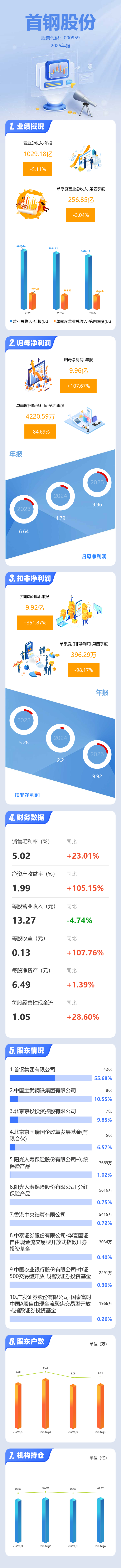 证券之星消息,首钢股份2025年年报显示,当年度公司主营收入1029.18亿元,同比下降5.11%;归母净利润9.96亿元,同比上升107.68%;扣非净利润9.92亿元,同比上升351.87%;其中2025年第四季度,公司单季度主营收入256.85亿元,同比下降3.05%;单季度归母净利润4220.59万元,同比下降84.69%;单季度扣非净利润396.29万元,同比下降98.18%;负债率55.73%,投资收益4453.04万元,财务费用7.38亿元,毛利率5.02%。
