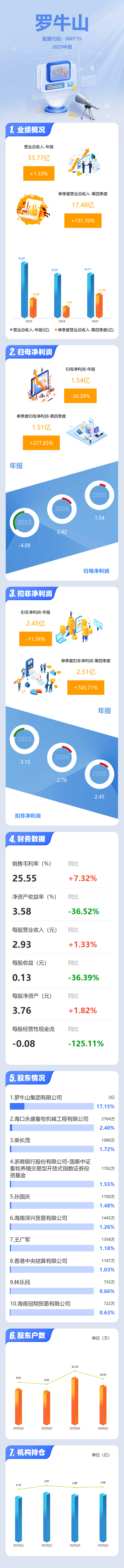 证券之星消息,罗牛山2025年年报显示,当年度公司主营收入33.77亿元,同比上升1.34%;归母净利润1.54亿元,同比下降36.39%;扣非净利润2.45亿元,同比下降11.34%;其中2025年第四季度,公司单季度主营收入17.48亿元,同比上升131.71%;单季度归母净利润1.51亿元,同比上升277.86%;单季度扣非净利润2.31亿元,同比上升745.72%;负债率50.29%,投资收益771.15万元,财务费用3555.04万元,毛利率25.55%。