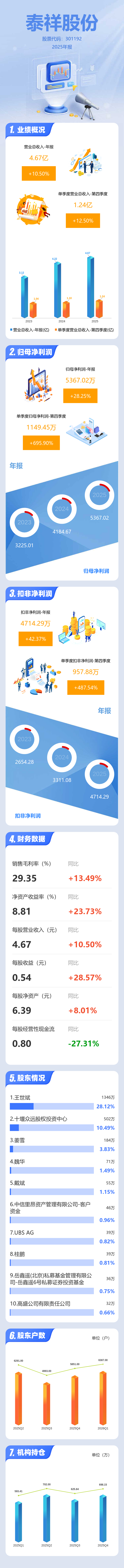 证券之星消息,泰祥股份2025年年报显示,当年度公司主营收入4.67亿元,同比上升10.5%;归母净利润5367.02万元,同比上升28.25%;扣非净利润4714.29万元,同比上升42.38%;其中2025年第四季度,公司单季度主营收入1.24亿元,同比上升12.5%;单季度归母净利润1149.45万元,同比上升695.9%;单季度扣非净利润957.88万元,同比上升487.54%;负债率28.02%,投资收益162.39万元,财务费用20.03万元,毛利率29.35%。