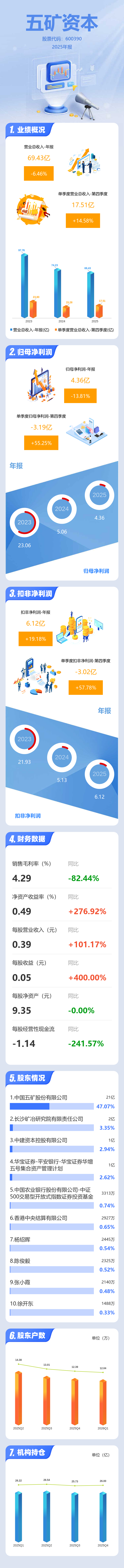 证券之星消息,五矿资本2025年年报显示,当年度公司主营收入69.43亿元,同比下降6.46%;归母净利润4.36亿元,同比下降13.82%;扣非净利润6.12亿元,同比上升19.19%;其中2025年第四季度,公司单季度主营收入17.51亿元,同比上升14.59%;单季度归母净利润-3.19亿元,同比上升55.26%;单季度扣非净利润-3.02亿元,同比上升57.79%;负债率65.09%,投资收益-32.45亿元,财务费用3.41亿元,毛利率4.29%。