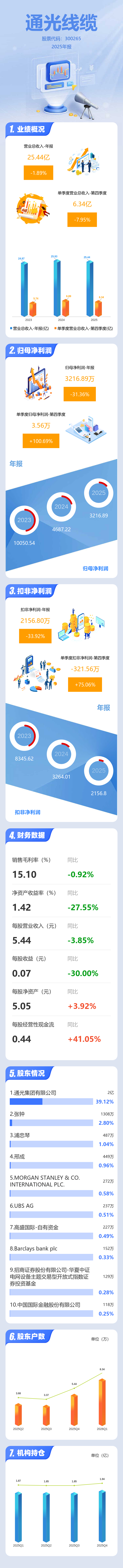 证券之星消息,通光线缆2025年年报显示,当年度公司主营收入25.44亿元,同比下降1.9%;归母净利润3216.89万元,同比下降31.37%;扣非净利润2156.8万元,同比下降33.92%;其中2025年第四季度,公司单季度主营收入6.34亿元,同比下降7.96%;单季度归母净利润3.56万元,同比上升100.69%;单季度扣非净利润-321.56万元,同比上升75.07%;负债率31.14%,投资收益52.3万元,财务费用1807.56万元,毛利率15.1%。