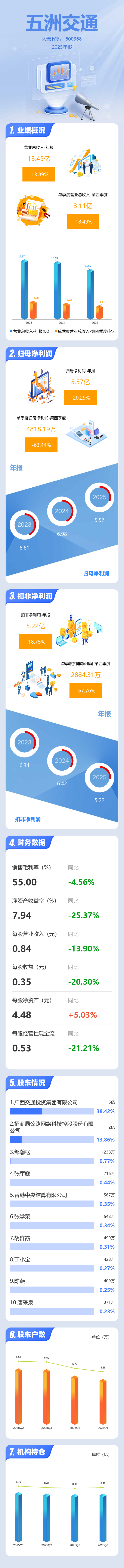 证券之星消息,五洲交通2025年年报显示,当年度公司主营收入13.45亿元,同比下降13.9%;归母净利润5.57亿元,同比下降20.3%;扣非净利润5.22亿元,同比下降18.75%;其中2025年第四季度,公司单季度主营收入3.11亿元,同比下降18.5%;单季度归母净利润4818.19万元,同比下降63.45%;单季度扣非净利润2884.31万元,同比下降67.77%;负债率39.03%,投资收益1.64亿元,财务费用7617.57万元,毛利率55.0%。