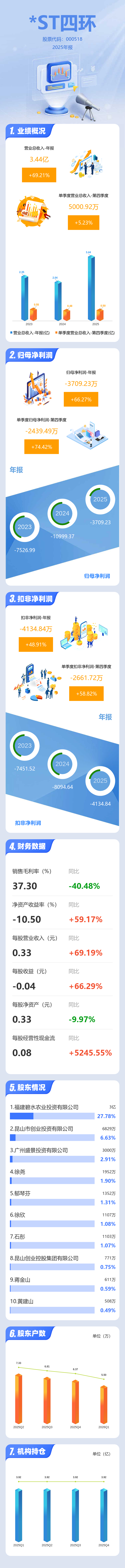 证券之星消息,*ST四环2025年年报显示,当年度公司主营收入3.44亿元,同比上升69.22%;归母净利润-3709.23万元,同比上升66.28%;扣非净利润-4134.84万元,同比上升48.92%;其中2025年第四季度,公司单季度主营收入5000.92万元,同比上升5.23%;单季度归母净利润-2439.49万元,同比上升74.42%;单季度扣非净利润-2661.72万元,同比上升58.83%;负债率27.26%,投资收益355.75万元,财务费用170.35万元,毛利率37.3%。