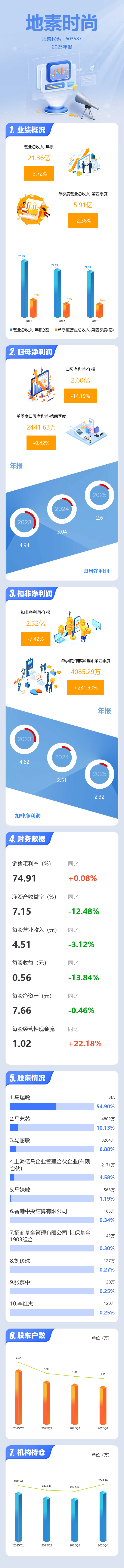 证券之星消息,地素时尚2025年年报显示,当年度公司主营收入21.36亿元,同比下降3.72%;归母净利润2.6亿元,同比下降14.2%;扣非净利润2.32亿元,同比下降7.42%;其中2025年第四季度,公司单季度主营收入5.91亿元,同比下降2.39%;单季度归母净利润2441.63万元,同比下降0.43%;单季度扣非净利润4085.29万元,同比上升231.91%;负债率15.57%,投资收益-123.24万元,财务费用-3220.78万元,毛利率74.91%。