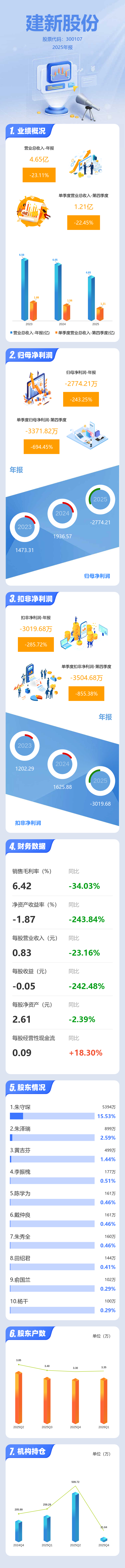 证券之星消息,建新股份2025年年报显示,当年度公司主营收入4.65亿元,同比下降23.12%;归母净利润-2774.21万元,同比下降243.25%;扣非净利润-3019.68万元,同比下降285.73%;其中2025年第四季度,公司单季度主营收入1.21亿元,同比下降22.45%;单季度归母净利润-3371.82万元,同比下降694.46%;单季度扣非净利润-3504.68万元,同比下降855.38%;负债率9.14%,投资收益43.75万元,财务费用-820.48万元,毛利率6.42%。