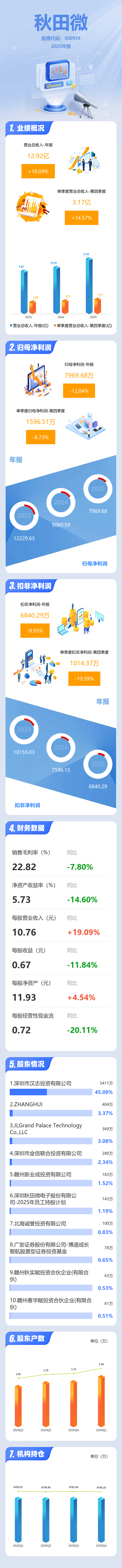 证券之星消息,秋田微2025年年报显示,当年度公司主营收入12.92亿元,同比上升19.1%;归母净利润7969.68万元,同比下降12.04%;扣非净利润6840.29万元,同比下降9.95%;其中2025年第四季度,公司单季度主营收入3.17亿元,同比上升14.57%;单季度归母净利润1596.51万元,同比下降8.74%;单季度扣非净利润1014.37万元,同比下降19.6%;负债率24.96%,投资收益846.53万元,财务费用-108.42万元,毛利率22.82%。