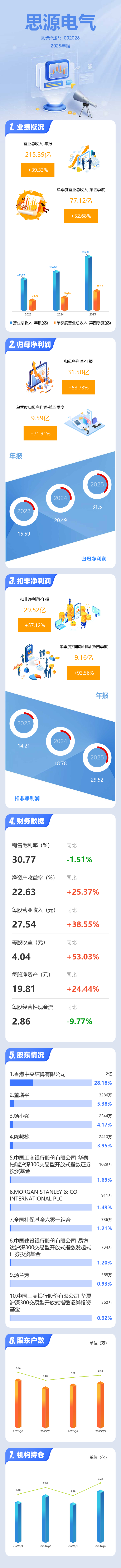 证券之星消息,思源电气2025年年报显示,当年度公司主营收入215.39亿元,同比上升39.34%;归母净利润31.5亿元,同比上升53.74%;扣非净利润29.52亿元,同比上升57.13%;其中2025年第四季度,公司单季度主营收入77.12亿元,同比上升52.69%;单季度归母净利润9.59亿元,同比上升71.92%;单季度扣非净利润9.16亿元,同比上升93.56%;负债率47.05%,投资收益5602.28万元,财务费用-760.86万元,毛利率30.77%。