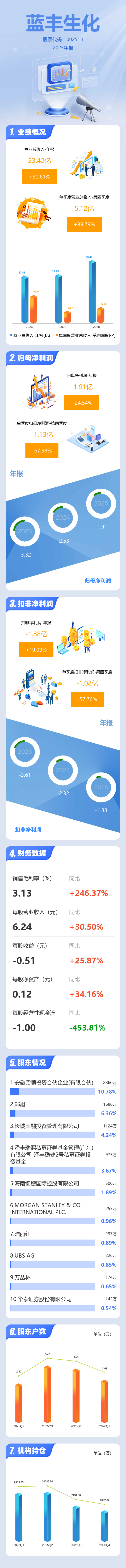 证券之星消息,蓝丰生化2025年年报显示,当年度公司主营收入23.42亿元,同比上升30.61%;归母净利润-1.91亿元,同比上升24.54%;扣非净利润-1.88亿元,同比上升19.09%;其中2025年第四季度,公司单季度主营收入5.12亿元,同比上升39.8%;单季度归母净利润-1.13亿元,同比下降67.99%;单季度扣非净利润-1.08亿元,同比下降57.77%;负债率92.07%,投资收益238.14万元,财务费用4760.22万元,毛利率3.13%。