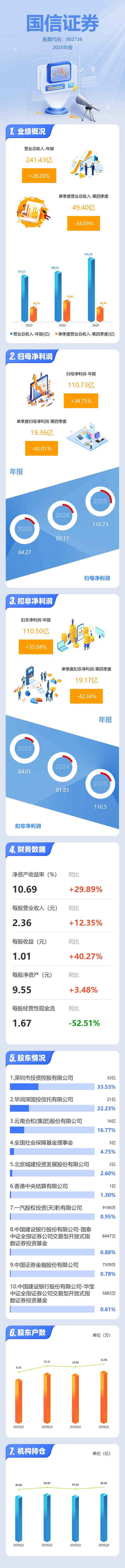 证券之星消息,国信证券2025年年报显示,当年度公司主营收入241.43亿元,同比上升28.21%;归母净利润110.73亿元,同比上升34.76%;扣非净利润110.5亿元,同比上升35.04%;其中2025年第四季度,公司单季度主营收入49.4亿元,同比下降34.09%;单季度归母净利润19.36亿元,同比下降42.01%;单季度扣非净利润19.17亿元,同比下降42.35%;负债率77.18%,投资收益104.87亿元。