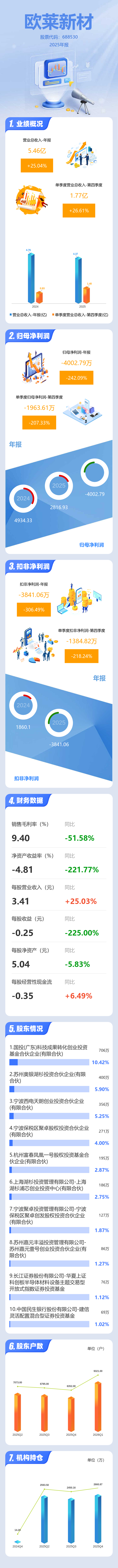 证券之星消息,欧莱新材2025年年报显示,当年度公司主营收入5.46亿元,同比上升25.04%;归母净利润-4002.79万元,同比下降242.1%;扣非净利润-3841.06万元,同比下降306.5%;其中2025年第四季度,公司单季度主营收入1.77亿元,同比上升26.62%;单季度归母净利润-1963.61万元,同比下降207.33%;单季度扣非净利润-1384.82万元,同比下降218.25%;负债率41.51%,投资收益420.98万元,财务费用436.85万元,毛利率9.4%。