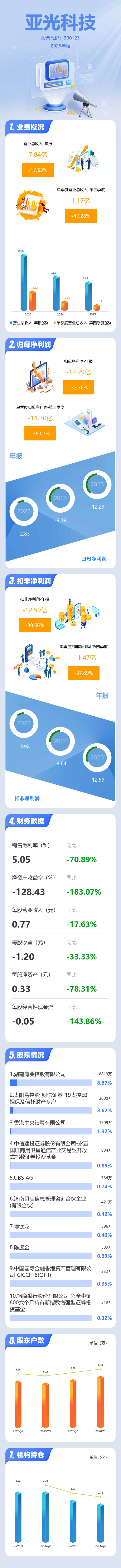 证券之星消息,亚光科技2025年年报显示,当年度公司主营收入7.84亿元,同比下降17.63%;归母净利润-12.29亿元,同比下降33.77%;扣非净利润-12.59亿元,同比下降30.66%;其中2025年第四季度,公司单季度主营收入1.17亿元,同比下降47.29%;单季度归母净利润-11.3亿元,同比下降35.08%;单季度扣非净利润-11.47亿元,同比下降37.89%;负债率86.6%,投资收益687.15万元,财务费用1.46亿元,毛利率5.05%。