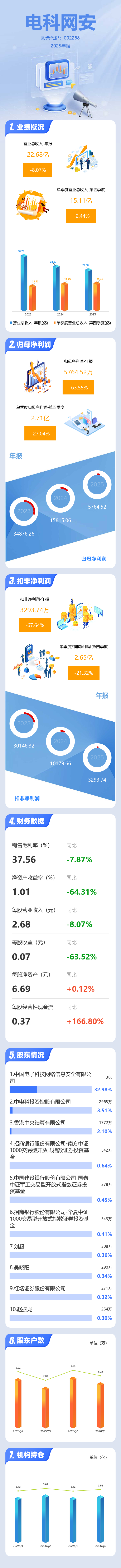 证券之星消息,电科网安2025年年报显示,当年度公司主营收入22.68亿元,同比下降8.08%;归母净利润5764.52万元,同比下降63.55%;扣非净利润3293.74万元,同比下降67.64%;其中2025年第四季度,公司单季度主营收入15.11亿元,同比上升2.44%;单季度归母净利润2.71亿元,同比下降27.05%;单季度扣非净利润2.65亿元,同比下降21.33%;负债率23.38%,投资收益1122.85万元,财务费用-1650.18万元,毛利率37.56%。