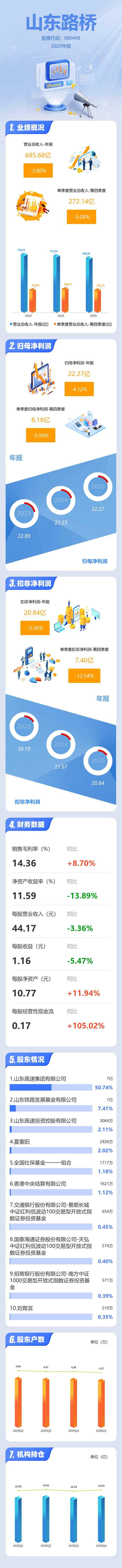 证券之星消息,山东路桥2025年年报显示,当年度公司主营收入685.68亿元,同比下降3.9%;归母净利润22.27亿元,同比下降4.12%;扣非净利润20.84亿元,同比下降3.36%;其中2025年第四季度,公司单季度主营收入272.14亿元,同比下降5.08%;单季度归母净利润8.18亿元,同比下降5.56%;单季度扣非净利润7.4亿元,同比下降12.55%;负债率76.51%,投资收益2.16亿元,财务费用7.47亿元,毛利率14.36%。