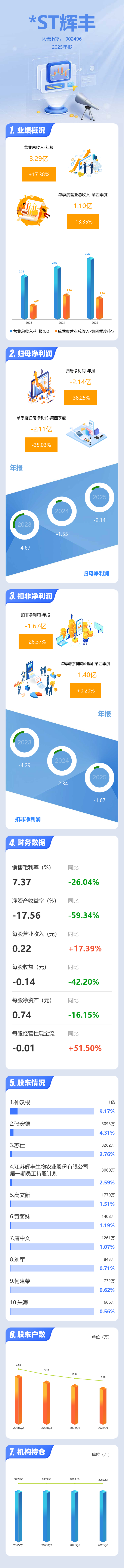 证券之星消息,*ST辉丰2025年年报显示,当年度公司主营收入3.29亿元,同比上升17.39%;归母净利润-2.14亿元,同比下降38.26%;扣非净利润-1.67亿元,同比上升28.38%;其中2025年第四季度,公司单季度主营收入1.1亿元,同比下降13.35%;单季度归母净利润-2.11亿元,同比下降35.04%;单季度扣非净利润-1.4亿元,同比上升0.21%;负债率46.46%,投资收益6231.98万元,财务费用1877.15万元,毛利率7.37%。