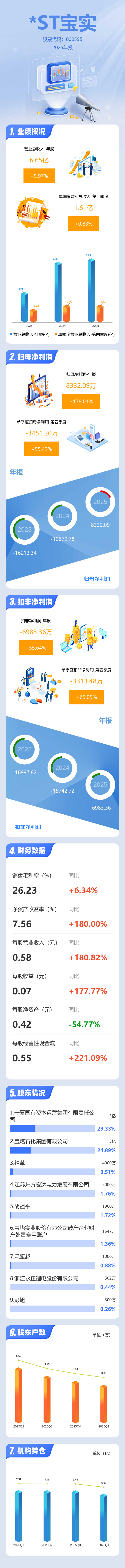 证券之星消息,*ST宝实2025年年报显示,当年度公司主营收入6.65亿元,同比上升5.98%;归母净利润8332.09万元,同比上升178.02%;扣非净利润-6983.36万元,同比上升55.64%;其中2025年第四季度,公司单季度主营收入1.61亿元,同比上升0.83%;单季度归母净利润-3451.2万元,同比上升55.43%;单季度扣非净利润-3313.48万元,同比上升65.06%;负债率89.42%,投资收益17.08万元,财务费用1.33亿元,毛利率26.23%。