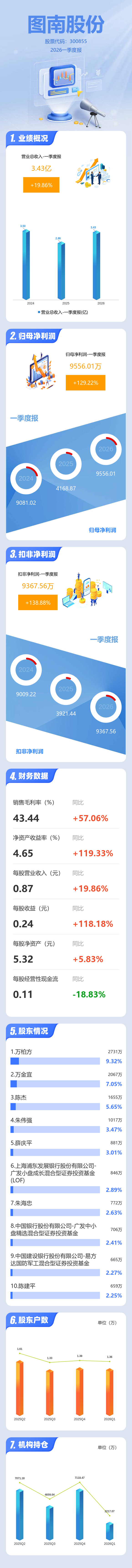证券之星消息,图南股份2026年一季报显示,一季度公司主营收入3.43亿元,同比上升19.87%;归母净利润9556.01万元,同比上升129.22%;扣非净利润9367.56万元,同比上升138.88%;负债率38.92%,财务费用275.78万元,毛利率43.44%。