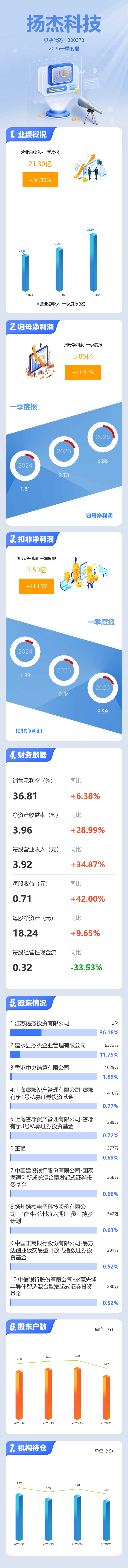 证券之星消息,扬杰科技2026年一季报显示,一季度公司主营收入21.3亿元,同比上升34.87%;归母净利润3.85亿元,同比上升41.01%;扣非净利润3.59亿元,同比上升41.15%;负债率39.43%,投资收益453.59万元,财务费用4076.3万元,毛利率36.81%。