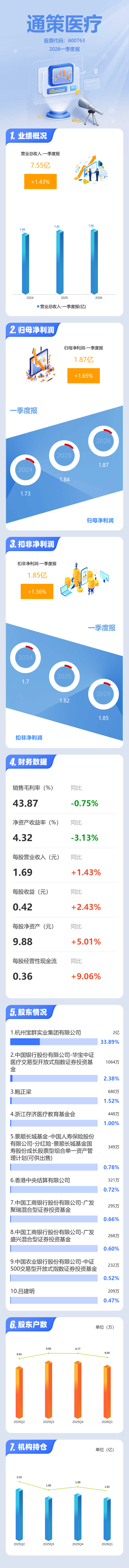 证券之星消息,通策医疗2026年一季报显示,一季度公司主营收入7.55亿元,同比上升1.43%;归母净利润1.87亿元,同比上升1.66%;扣非净利润1.85亿元,同比上升1.37%;负债率23.29%,投资收益880.6万元,财务费用823.28万元,毛利率43.87%。
