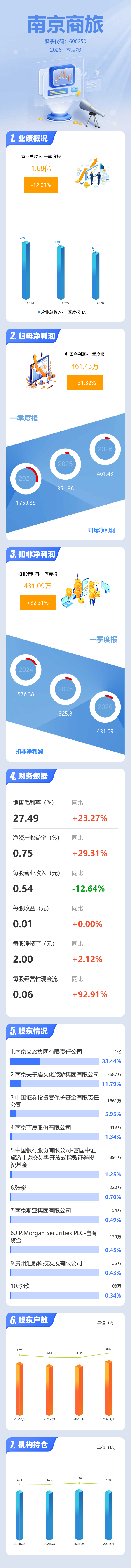 证券之星消息,南京商旅2026年一季报显示,一季度公司主营收入1.68亿元,同比下降12.03%;归母净利润461.43万元,同比上升31.32%;扣非净利润431.09万元,同比上升32.32%;负债率53.04%,投资收益556.74万元,财务费用794.6万元,毛利率27.49%。