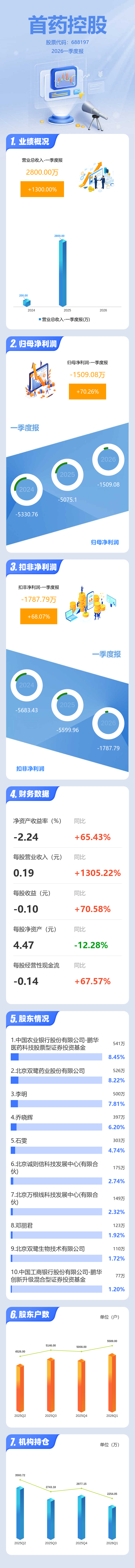 证券之星消息,首药控股2026年一季报显示,一季度公司主营收入2800.0万元,同比上升1300.0%;归母净利润-1509.08万元,同比上升70.27%;扣非净利润-1787.79万元,同比上升68.07%;负债率13.91%,投资收益153.77万元,财务费用1.3万元。