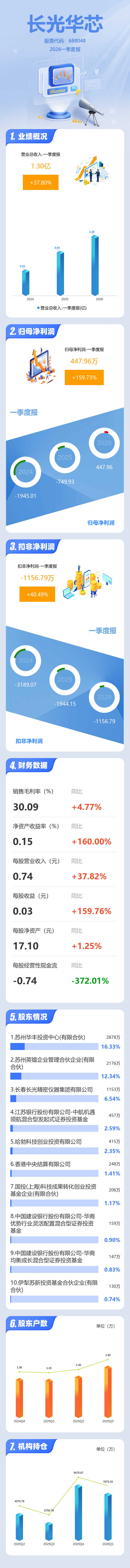 证券之星消息,长光华芯2026年一季报显示,一季度公司主营收入1.3亿元,同比上升37.81%;归母净利润447.96万元,同比上升159.73%;扣非净利润-1156.79万元,同比上升40.5%;负债率9.53%,投资收益209.71万元,财务费用-1.63万元,毛利率30.09%。