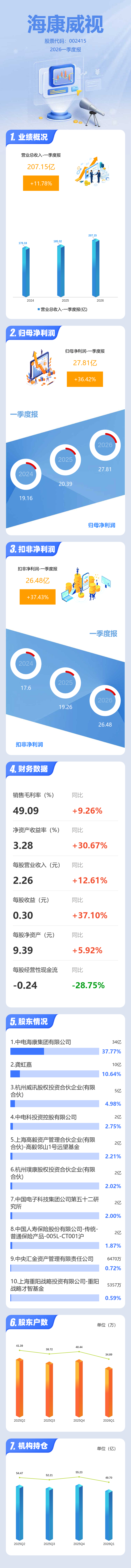 证券之星消息,海康威视2026年一季报显示,一季度公司主营收入207.15亿元,同比上升11.78%;归母净利润27.81亿元,同比上升36.42%;扣非净利润26.48亿元,同比上升37.44%;负债率30.26%,投资收益1.84亿元,财务费用3.08亿元,毛利率49.09%。
