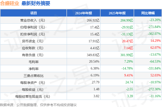 据证券之星公开数据整理,近期合盛硅业(603260)发布2025年年报。截至本报告期末,公司营业总收入204.99亿元,同比下降23.2%,归母净利润-29.91亿元,同比下降271.84%。按单季度数据看,第四季度营业总收入52.93亿元,同比下降16.27%,第四季度归母净利润-26.69亿元,同比下降1033.32%。本报告期合盛硅业短期债务压力上升,流动比率达0.33。