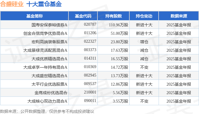 持有合盛硅业最多的基金为国寿安保泰裕债券A,目前规模为35.53亿元,最新净值1.2105(4月17日),较上一交易日上涨0.12%,近一年上涨6.11%。该基金现任基金经理为李谦 代劲。
