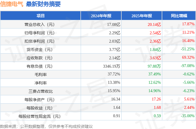 据证券之星公开数据整理,近期信捷电气(603416)发布2025年年报。截至本报告期末,公司营业总收入20.14亿元,同比上升17.87%,归母净利润2.54亿元,同比上升11.21%。按单季度数据看,第四季度营业总收入6.32亿元,同比上升26.89%,第四季度归母净利润7400.89万元,同比上升36.31%。本报告期信捷电气应收账款上升,应收账款同比增幅达69.32%。