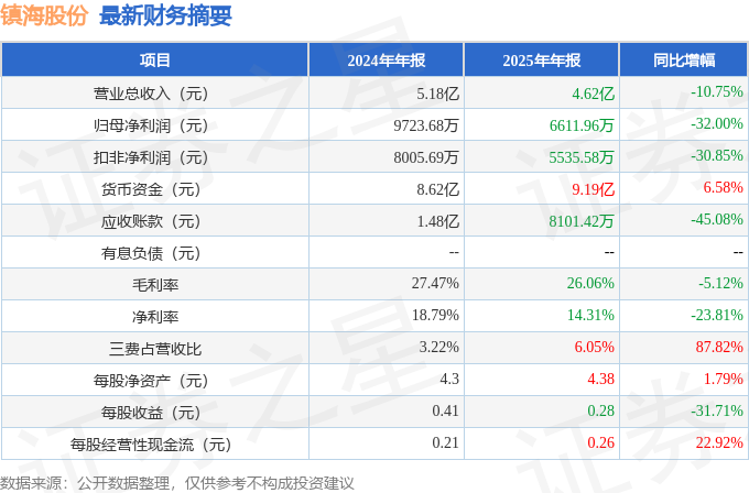 据证券之星公开数据整理,近期镇海股份(603637)发布2025年年报。截至本报告期末,公司营业总收入4.62亿元,同比下降10.75%,归母净利润6611.96万元,同比下降32.0%。按单季度数据看,第四季度营业总收入1.67亿元,同比下降12.13%,第四季度归母净利润1443.19万元,同比下降64.85%。本报告期镇海股份公司应收账款体量较大,当期应收账款占最新年报归母净利润比达122.53%。