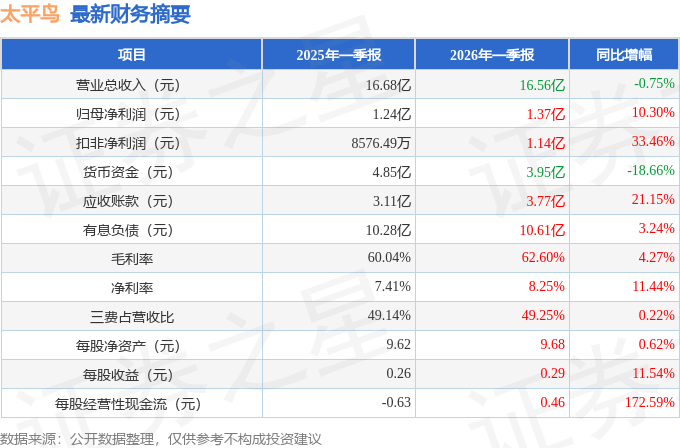据证券之星公开数据整理,近期太平鸟(603877)发布2026年一季报。截至本报告期末,公司营业总收入16.56亿元,同比下降0.75%,归母净利润1.37亿元,同比上升10.3%。按单季度数据看,第一季度营业总收入16.56亿元,同比下降0.75%,第一季度归母净利润1.37亿元,同比上升10.3%。本报告期太平鸟盈利能力上升,毛利率同比增幅4.27%,净利率同比增幅11.44%。
