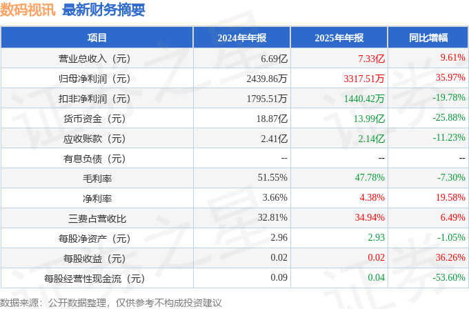 据证券之星公开数据整理,近期数码视讯(300079)发布2025年年报。截至本报告期末,公司营业总收入7.33亿元,同比上升9.61%,归母净利润3317.51万元,同比上升35.97%。按单季度数据看,第四季度营业总收入2.68亿元,同比下降9.33%,第四季度归母净利润855.43万元,同比上升310.35%。本报告期数码视讯公司应收账款体量较大,当期应收账款占最新年报归母净利润比达644.99%。