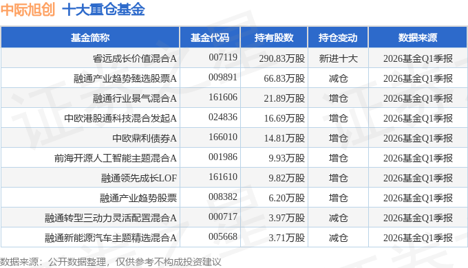 持有中际旭创最多的基金为睿远成长价值混合A,目前规模为165.0亿元,最新净值2.2691(4月16日),较上一交易日上涨3.63%,近一年上涨105.96%。该基金现任基金经理为傅鹏博 朱璘。