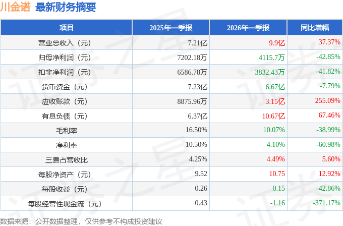 据证券之星公开数据整理,近期川金诺(300505)发布2026年一季报。根据财报显示,川金诺增收不增利。截至本报告期末,公司营业总收入9.9亿元,同比上升37.37%,归母净利润4115.7万元,同比下降42.85%。按单季度数据看,第一季度营业总收入9.9亿元,同比上升37.37%,第一季度归母净利润4115.7万元,同比下降42.85%。