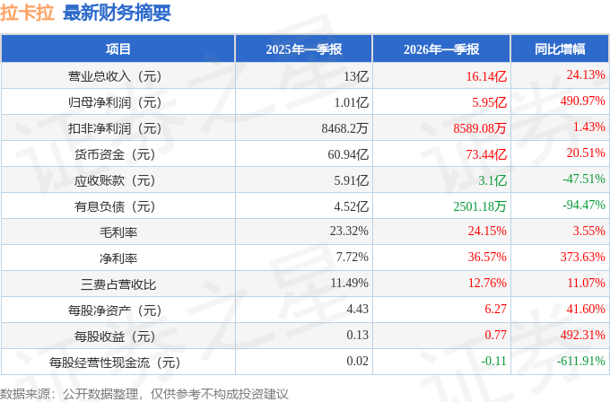 据证券之星公开数据整理,近期拉卡拉(300773)发布2026年一季报。截至本报告期末,公司营业总收入16.14亿元,同比上升24.13%,归母净利润5.95亿元,同比上升490.97%。按单季度数据看,第一季度营业总收入16.14亿元,同比上升24.13%,第一季度归母净利润5.95亿元,同比上升490.97%。本报告期拉卡拉盈利能力上升,毛利率同比增幅3.55%,净利率同比增幅373.63%。